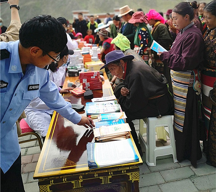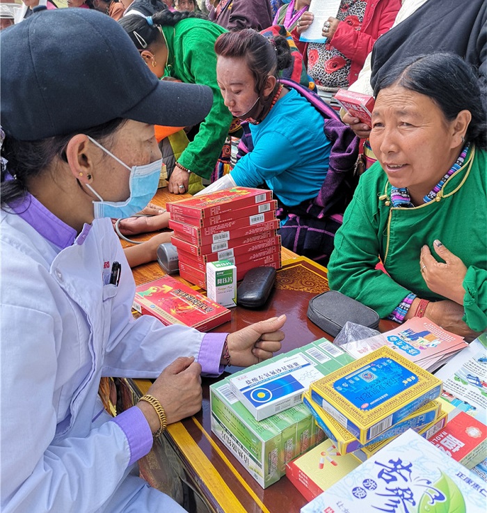 當天上午,全國婦聯(lián)宣傳部、自治區(qū)婦聯(lián)、拉薩市婦聯(lián)、那曲市婦聯(lián)一行來到安置點為群眾贈送了藏漢雙語書籍。阜康義診工作隊也來到現(xiàn)場為安置點居民量血壓、檢查病情并詢問身體情況,耐心細致地為群眾分析病情、講解日常衛(wèi)生保健、合理用藥等衛(wèi)生常識,認真解答關于常見病、多發(fā)病的預防診治及愈后注意事項。僅一個上午時間就為100余名安置點群眾開展了問診、聽診、答疑、測血壓和健康知識宣傳,免費發(fā)放各類藥品價值4萬余元 。