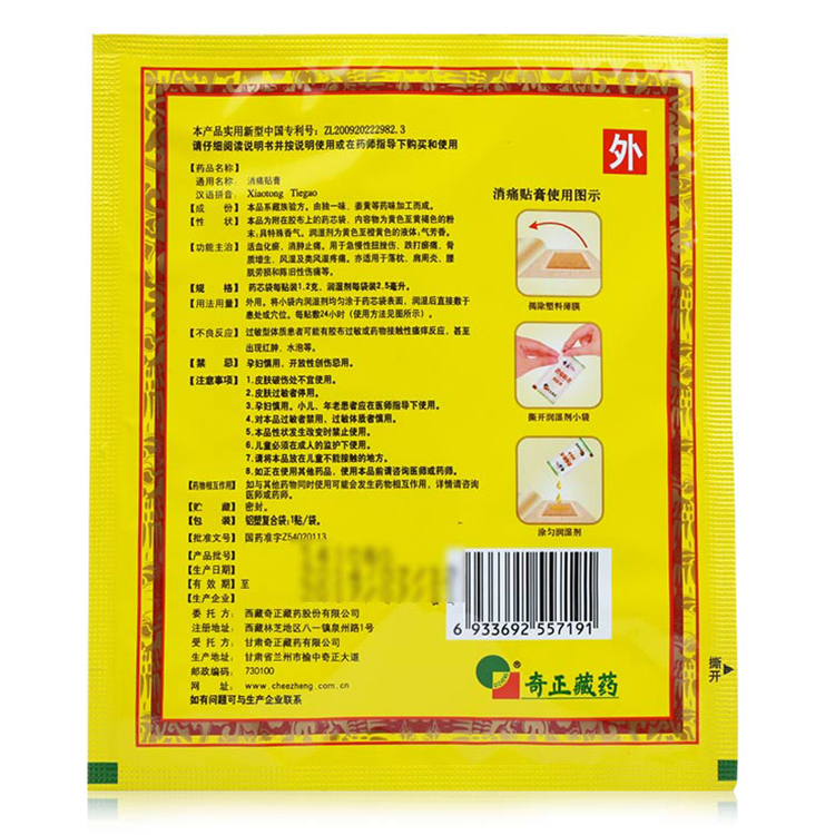 【用法用量】外用。清潔患部皮膚,將藥貼的塑料薄膜接除,將小袋內(nèi)潤濕劑均勻涂在藥墊表面,敷于患處或穴位,輕壓周邊使膠布貼實,每貼敷24小時。急性期一貼一個療程,慢性期五貼一個療程。