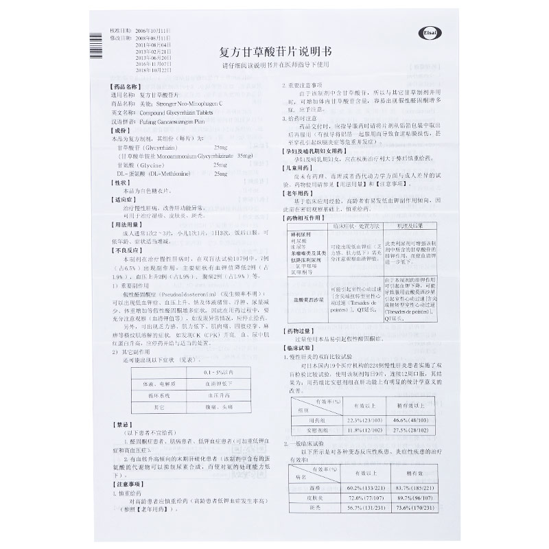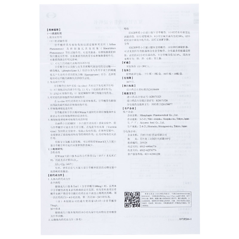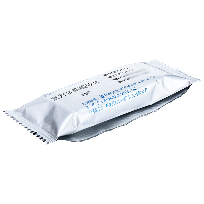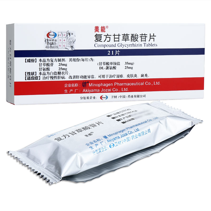 【成份】本品為復(fù)方制劑,其組份(每片)為:甘草酸苷(Glyeyrrhizin)25mg、(甘草酸單胺鹽Monoammonium Glycyrrhizinate 35mg)、甘氨酸(Aminoacetic Acid)25mg、蛋氨酸(Methionine)25mg。