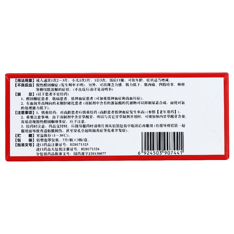 2.一般注意事項(xiàng):由于該制劑中含有甘草酸苷,所以與含其它甘草制劑并用時(shí),可增加體內(nèi)甘草酸苷含量,容易出現(xiàn)假性醛固酮增多癥,應(yīng)予注意。