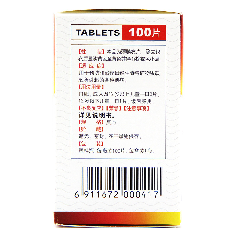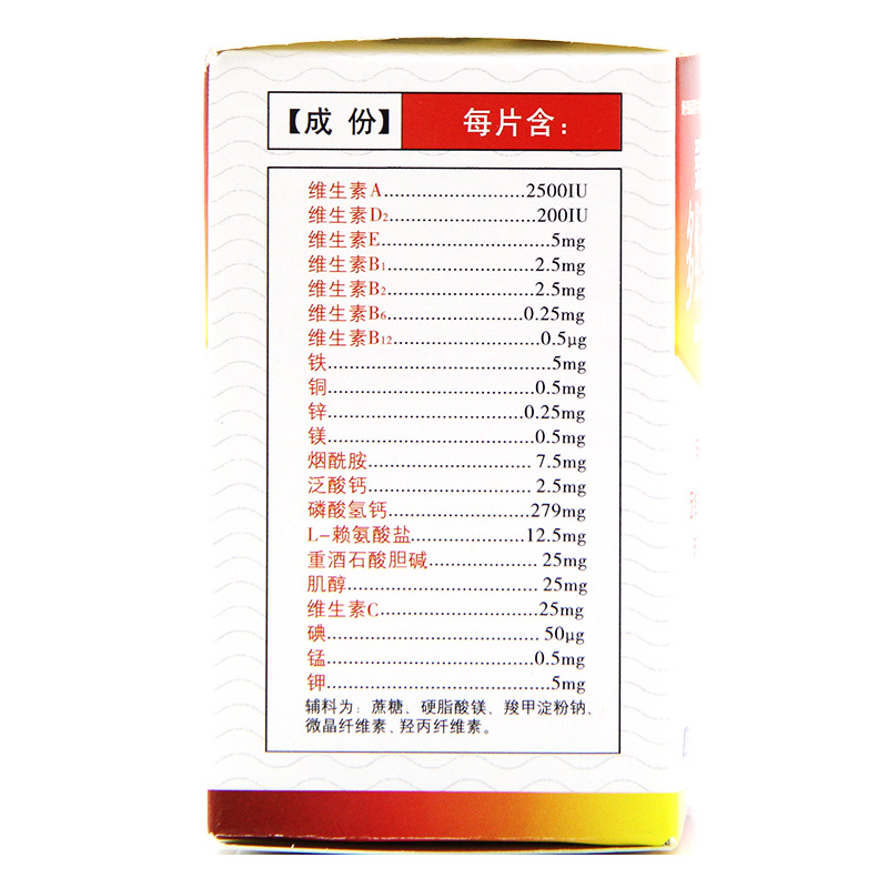 【主要成份】本品為復(fù)方制劑,每片含維生素A2500IU、維生素D200IU、維生素E5mg、維生素B12.5mg、維生素B22.5mg、維生素B60.25mg、維生素B120.5μg、鐵5mg、銅0.5mg、鋅0.25mg、鎂0.5mg、煙酰胺7.5mg、泛酸鈣2.5mg、磷酸氫鈣279mg、L-賴氨酸鹽12.5mg、重酒石酸膽堿25mg、肌醇25mg、維生素C25mg、碘50μg、錳0.5mg、鉀5mg。輔料為:蔗糖、硬脂酸鎂、羧甲淀粉鈉、微晶纖維素、羥丙纖維素。