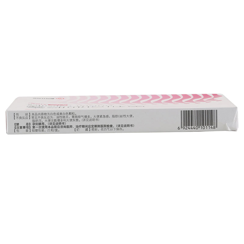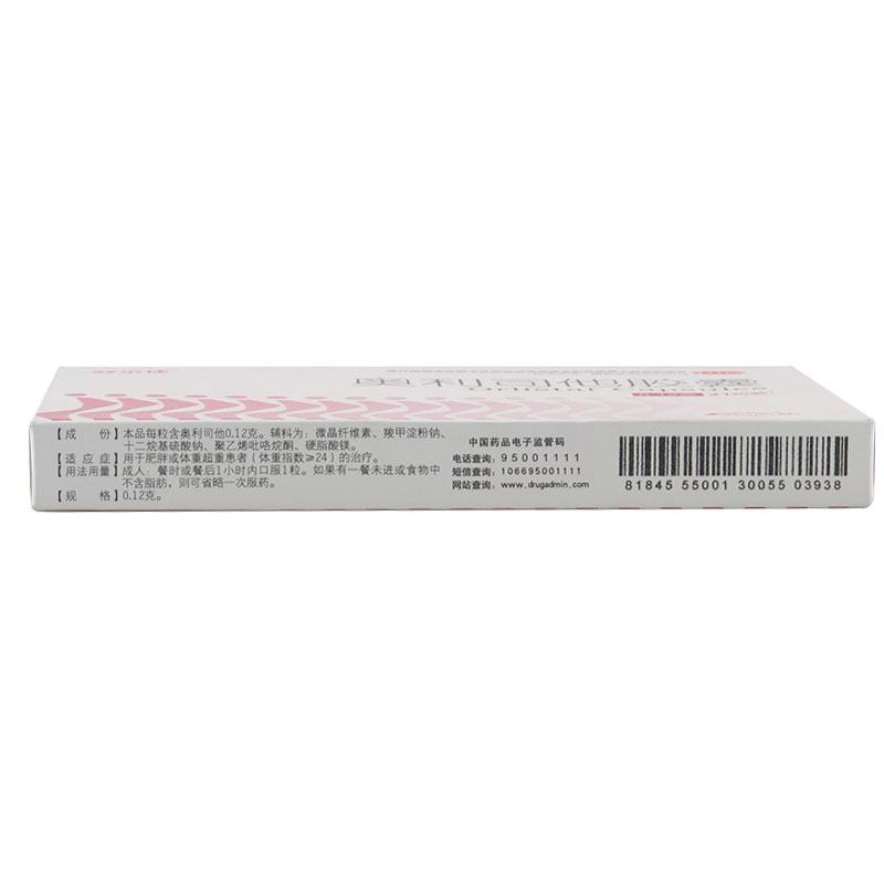 【主要成份】本品每粒含奧利司他0.12克,輔料為:預(yù)膠化淀粉、微粉硅膠和硬脂酸鎂。
