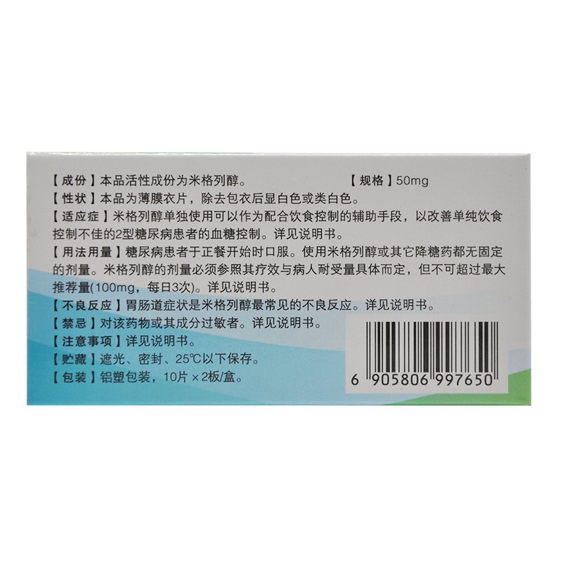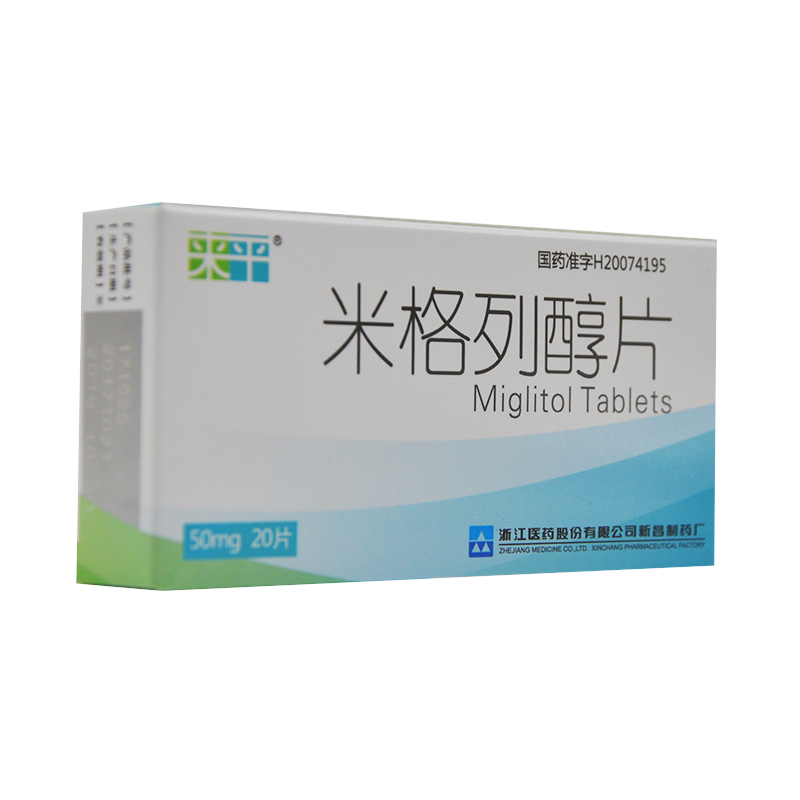 【用法用量】糖尿病患者使用米格列醇或其它降糖藥都無固定的劑量。米格列醇的劑量必須參照其療效與病人耐受量具體而定,但不可超過最大推薦量(100mg,3次/日)。米格列醇每次于正餐開始時(shí)服用,每日3次;從25mg開始并按下述方法逐漸加量,以便獲得既能減輕胃腸道的不良反應(yīng)又能控制高血糖癥狀的最小有效劑量。治療開始階段及劑量增加時(shí),以餐后 1 小時(shí)血糖作為米格列醇療效指標(biāo)來確定患者的最小有效量。其后,約 3個(gè)月左右檢測(cè)一次糖基化血紅蛋白。無論在米格列醇單獨(dú)使用還是與磺酰脲類藥物聯(lián)用情況下,治療目標(biāo)都是通過米格列醇的最小有效使用量來達(dá)到恢復(fù)患者正常餐后血糖及糖基化血紅蛋白水平為最終目的。初始劑量:推薦的初始劑量為25mg,每日正餐開始時(shí)服用,3次/日。然而為了減輕胃腸道的不良反應(yīng),有的患者在開始時(shí)采用25mg,1次/日的服藥方法,此后逐漸增加給藥次數(shù)直到3次/日。維持劑量:米格列醇的維持量是50mg,3次/日。為了改善使用米格列醇時(shí)患者胃腸道的不良反應(yīng),建議采用從25mg,3次/日,即最低有效量開始,然后逐漸加量的給藥方式。使用米格列醇25mg,3次/日4-8周后,劑量應(yīng)增至50mg,3次/日,維持時(shí)間大約3個(gè)月,隨后應(yīng)檢測(cè)糖基化血紅蛋白水平。若此時(shí)糖基化血紅蛋白水平未達(dá)到滿意程度,劑量增至100mg,3次/日,大推薦劑量。對(duì)照試驗(yàn)匯總數(shù)據(jù)顯示了糖基化血紅蛋白和1小時(shí)餐后血糖在推薦劑量范圍內(nèi)的變化趨勢(shì),然而,在上述試驗(yàn)中未進(jìn)行針對(duì)高血糖控制方面的量效研究。若服用米格列醇(100mg,3次/日)后,餐后血糖或糖基化血紅蛋白水平未見進(jìn)一步降低則要考慮減量。一旦找到了有效耐受量,就應(yīng)維持此劑量。最大劑量:米格列醇最大推薦劑量是100mg,3次/日。臨床試驗(yàn)證明服用更大劑量米格列醇(200mg,3次/日)雖可增加高血糖癥狀的控制效果,但同時(shí)也會(huì)增加其胃腸道不良反應(yīng)的發(fā)生率。與磺酰脲類藥物合用:磺酰脲可引起低血糖癥。臨床驗(yàn)證米格列醇聯(lián)用磺酰脲與單用磺酰脲相比,并不增高低血糖癥的發(fā)生率。然而二者聯(lián)用可引起血糖的進(jìn)一步降低,并提高低血糖癥發(fā)生的風(fēng)險(xiǎn)性,其原因可能是二者產(chǎn)生的累加效應(yīng)所致。若發(fā)生低血糖癥,應(yīng)及時(shí)調(diào)整藥物的劑量。